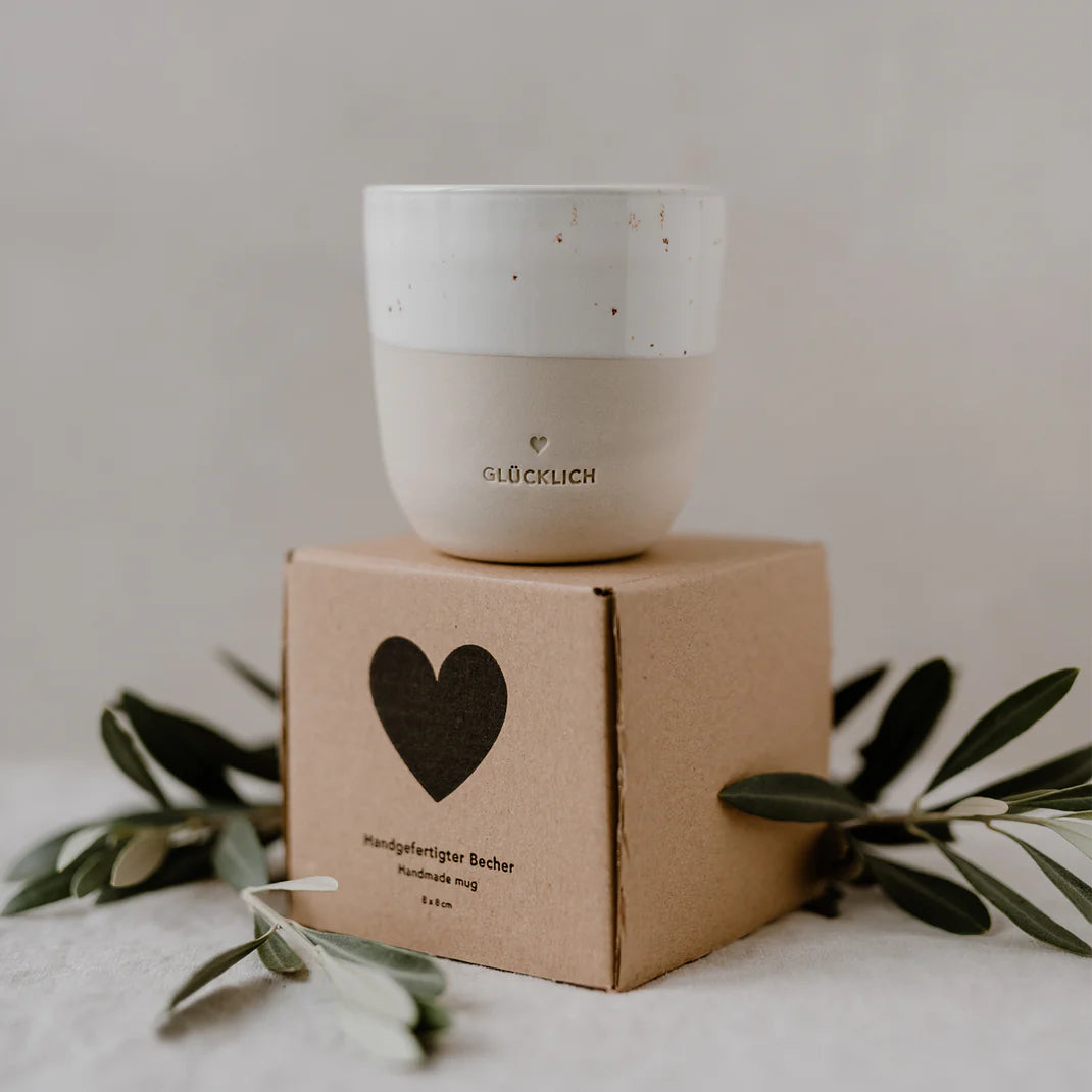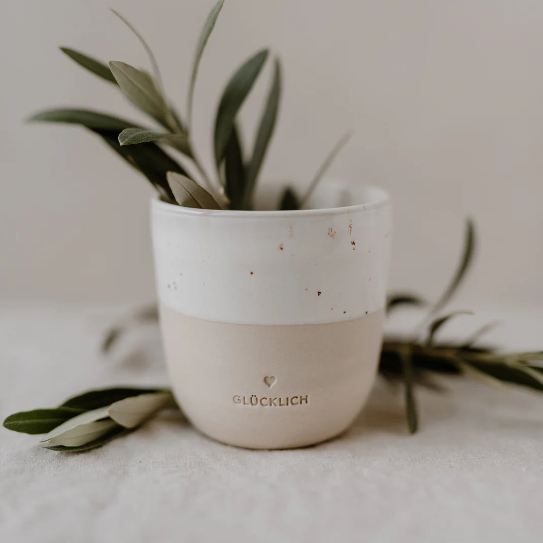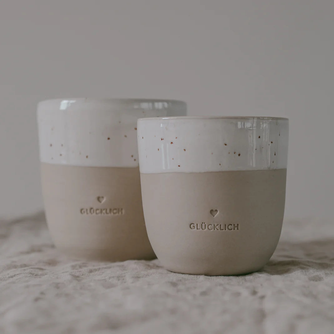 Wir haben sehr viel Herzblut in eine neue Kollektion gesteckt, die von der Form, dem Ton, dem Glazing, sowie dem Design von uns entwickelt wurde. Eine kleine Töpferei aus Portugal produziert diese wundervollen Becher in liebevoller Handarbeit & ist ein großartiger neuer Begleiter auf unserem kreativen Weg. Unsere Becher lassen die Herzen höher schlagen, die die Individualität von Ton & Glasur lieben, denn jeder einzelne Becher hat seinen ganz eigenen Touch. Da alle Becher mit der Hand gefertigt, gebrannt, geprägt, abgeschliffen, geglazt & nochmal gebrannt werden, gibt es Unterschiede in der Drucktiefe, in der Höhe sowie der Geradlinigkeit. Das minimalistische Design und die natürlichen Farbnuancen werden von einer wunderschönen Blindprägung “Glücklich” abgerundet. Wir sind verliebt & voller purer Freude & können es kaum abwarten unsere neue Kollektion in Euren Händen zu sehen!