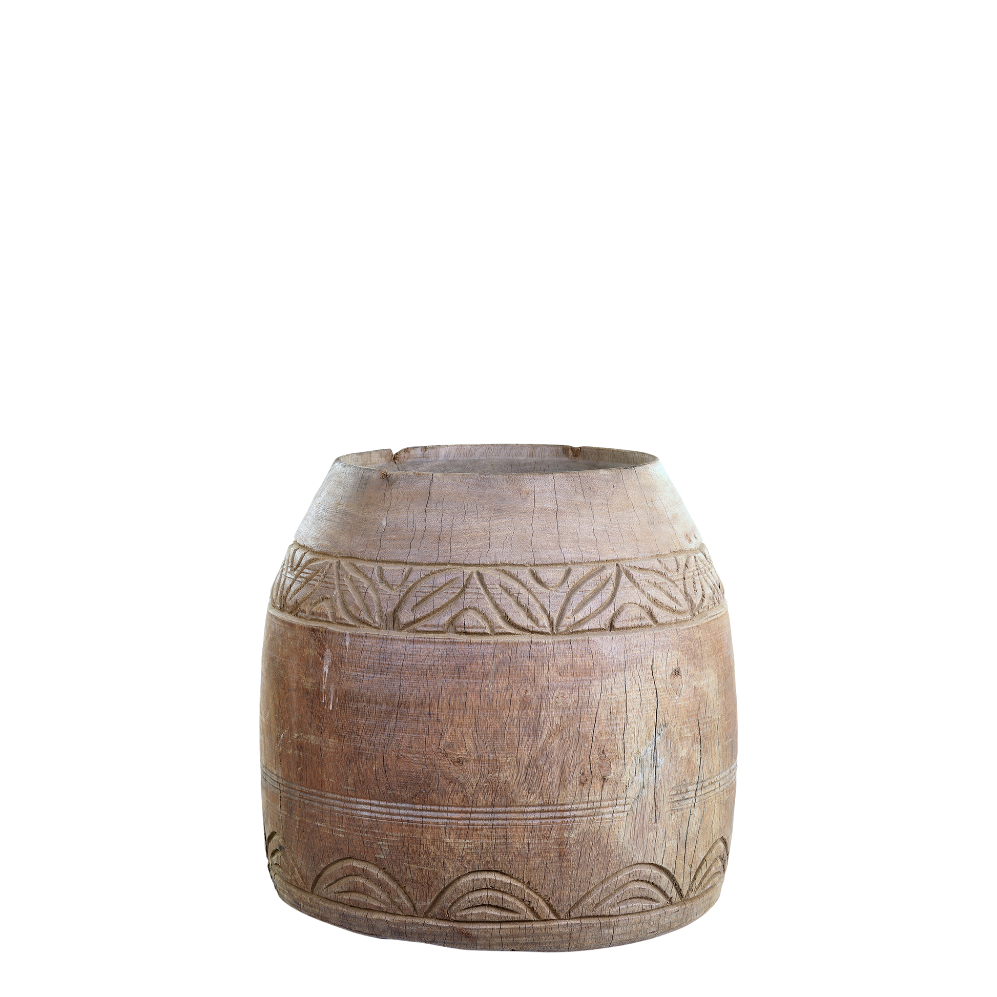 Diese wunderbare Vase von Chic Antique ist tatsächlich ein altes Artefakt mit einer früheren Verwendung. Indische Stammesdörfer verwendeten sie einst, um Buttermilch herzustellen. Sie ist schön mit handgefertigten Schnitzereien verziert und ein alter Schatz, der ein neues Leben verdient.