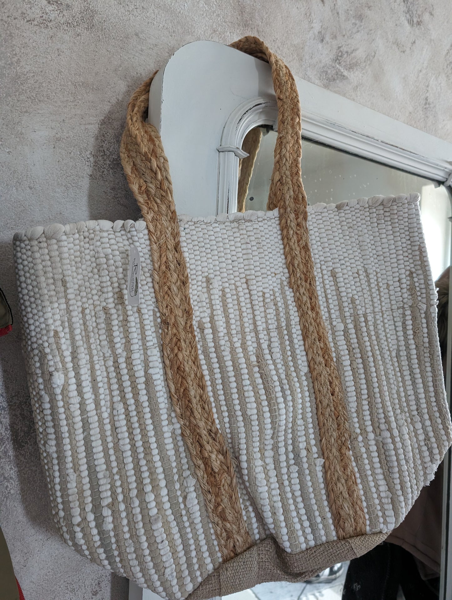 Recycled cotton/Jute. 40x20x20 cm. Shoulder handle hight 23 cm.