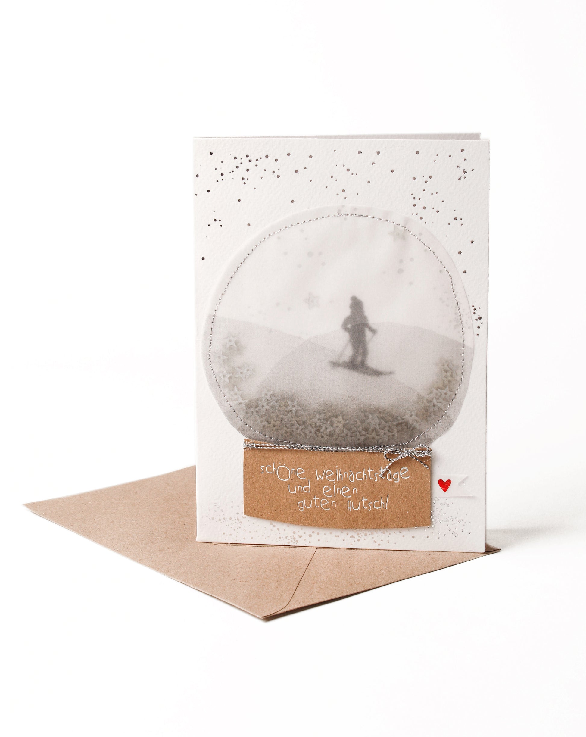 Schneekugelkarte. Skifahrer