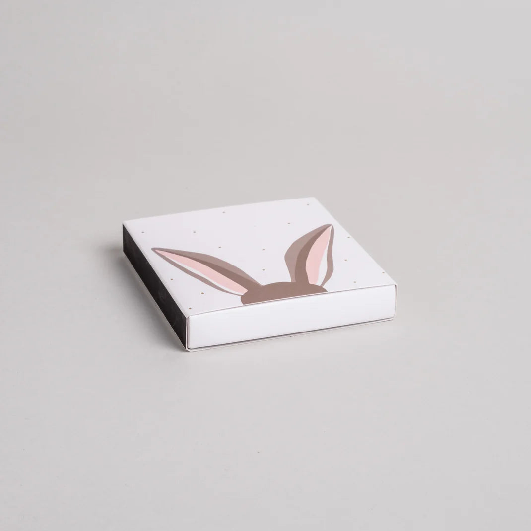 Die Verpackung begeistert mit einem liebevoll gestalteten Design: Auf der einen Seite zieren niedliche Hasenohren einen weißen Hintergrund mit goldenen Punkten, auf der anderen Seite strahlt der Schriftzug „Frohe Ostern“ in goldener Schrift – ebenfalls eingerahmt von zarten goldenen Punkten.