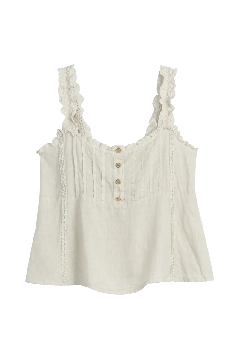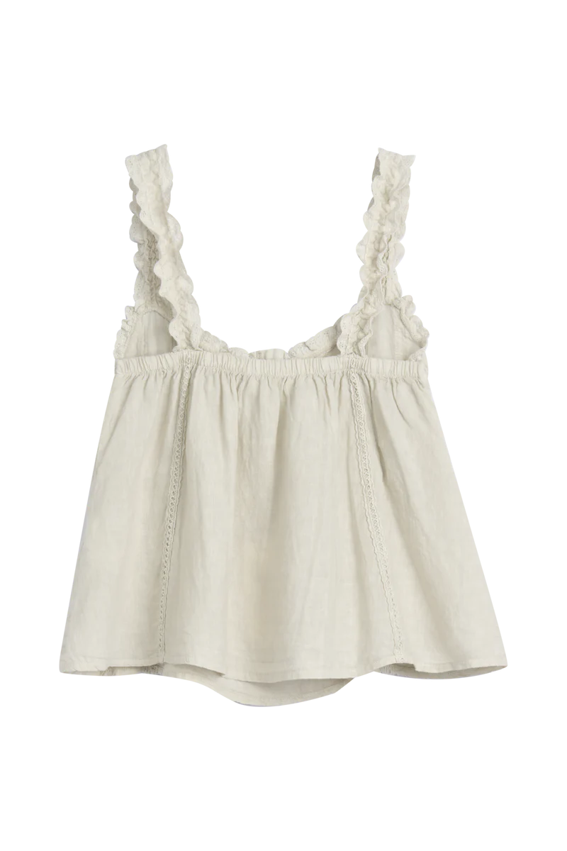 Gerüschte Schultergurte aus Spitze. Elastischer Kragen hinten. S/M: Brustumfang 88–96 cm (ungedehnt), Länge mit Trägern 56 cm. Das Model ist 170 cm groß und trägt Größe S/M. Material: 100 % Leinen Pflegehinweise: Maschinenwäsche bei 30°C, nicht im Trockner trocknen. Mit ähnlichen Farben waschen. Auf der Rückseite bügeln. Leinen kann beim Waschen um 2–4 % einlaufen, passt sich aber bei der Nutzung Ihrem Körper an. Hergestellt in der EU.